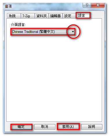 點選倒三角形 > 選「Chinese Traditional(繁體中文)」 > 套用 > 確定