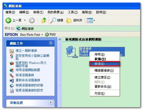 - 移動滑鼠到網路連線的圖示上頭,按滑鼠右鍵 -> 修復