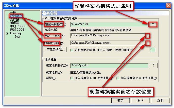 - 調整「錄製的音軌」路徑(例如:「D:\mp3\」)