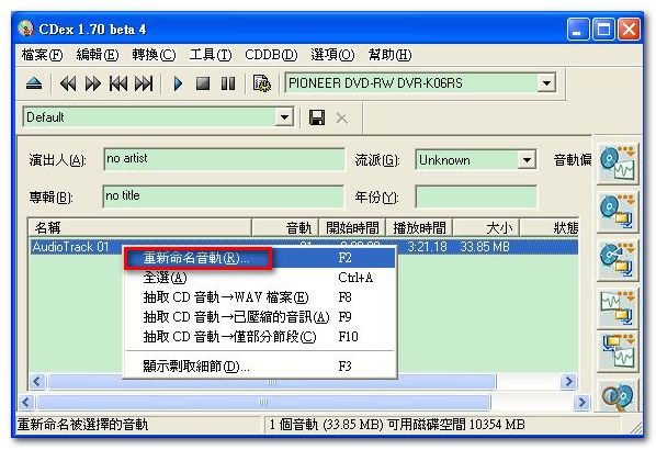 - 重新命名音軌「名稱」:在曲目上,點選滑鼠右鍵 -> 重新命名音軌