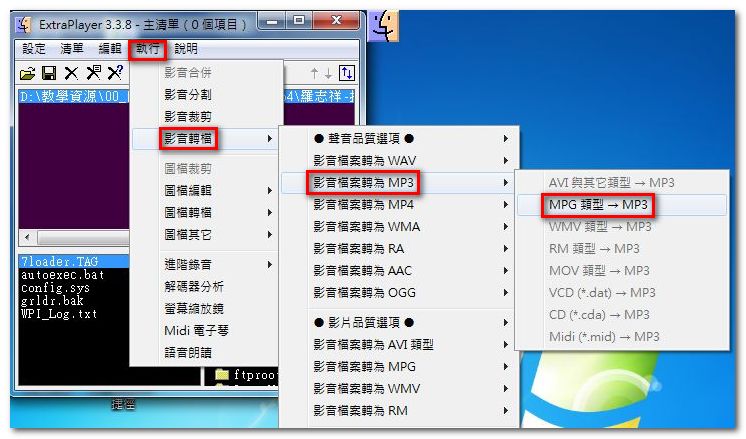 3. 執行 > 影音轉檔 > 影音檔案轉為 MP3 > MPG 類型 -> MP3