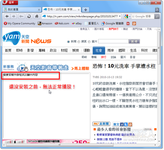 第1步 如圖,當我們還沒安裝 Windows Media Player Firefox Plugin 程式之前,使用 IE 以外的瀏覽器開啟內嵌 WMV 格式影片的網頁時,無法正常播放影片內容。
