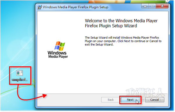 第2步 接著請下載安裝 Windows Media Player Firefox Plugin 程式,安裝方法很簡單,就是一直按「Next」、勾選「I accept...」再按「Next」、「Install」、「Finish」等按鈕即可完成。