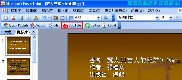 1.執行PowerPoint檔後,請點選【YouTube】。