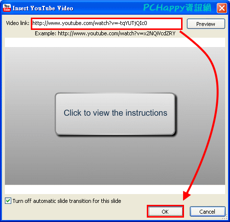 2.請貼上您要插入YouTube的網址後,再點選【OK】即可。