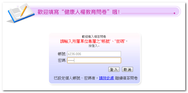 - 輸入學校帳號、問卷密碼後,按「登入」