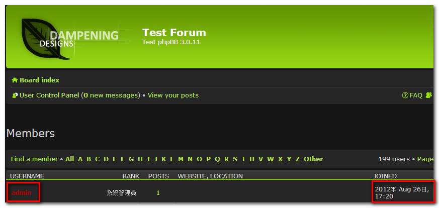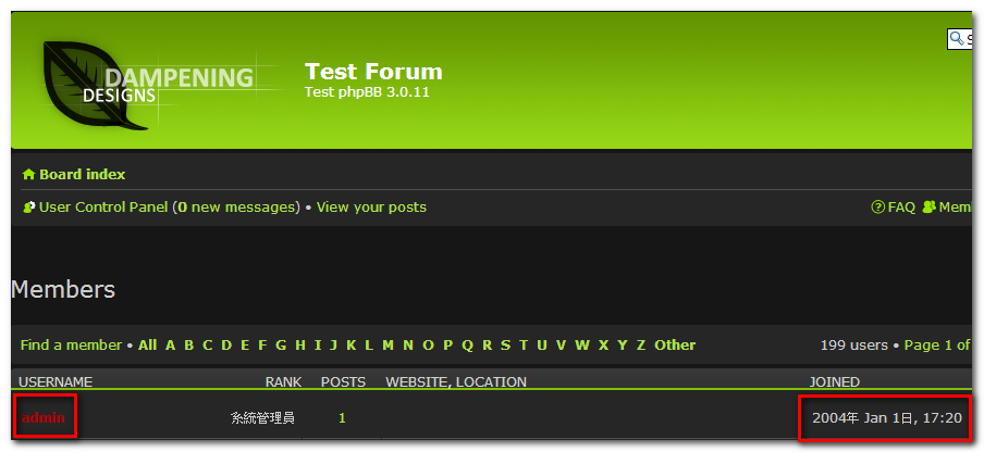 調整(phpBB 3)測試論壇會員(admin)的註冊時間(如下圖) 。