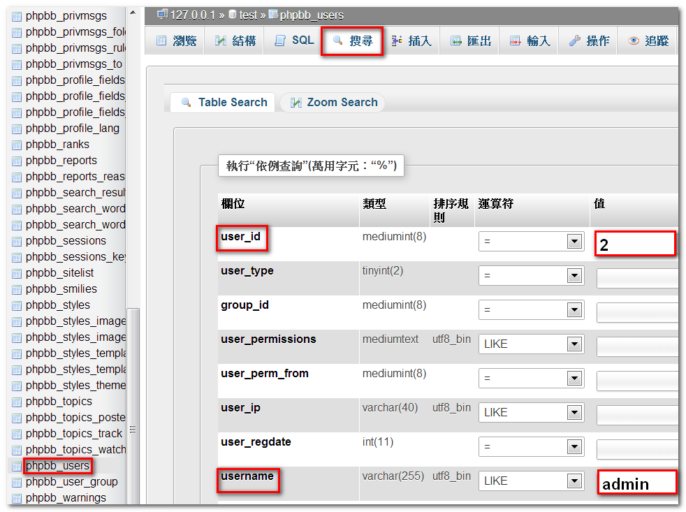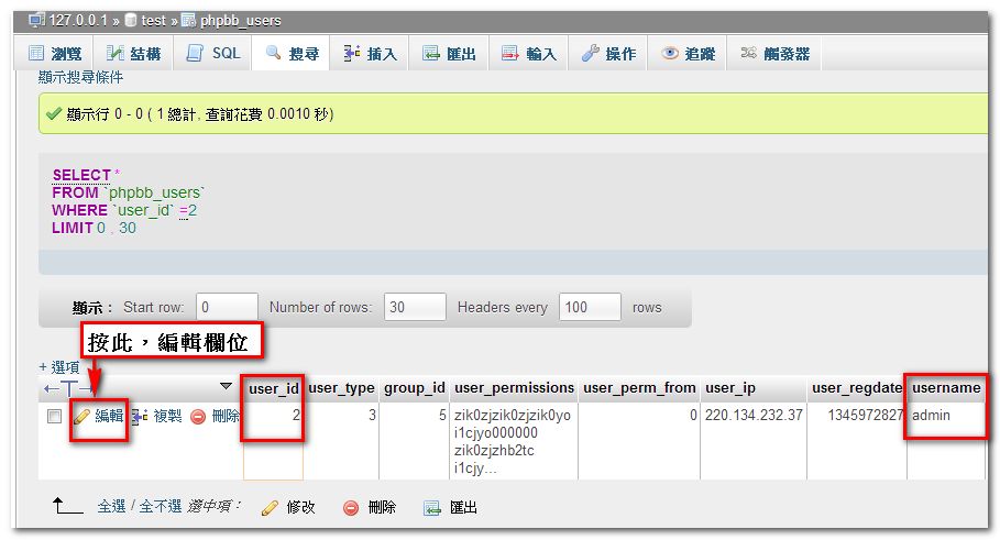 1. 進入 phpMyAdmin,找到論壇 phpBB3 資料庫,再找到 phpbb_users 資料表;