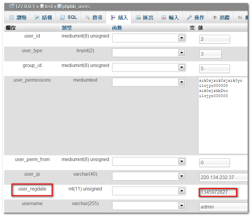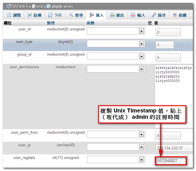2. 按「編輯」,瀏覽 admin 的註冊時間(user_regdate),複製其 Unix Timestamp 值「1345972827」