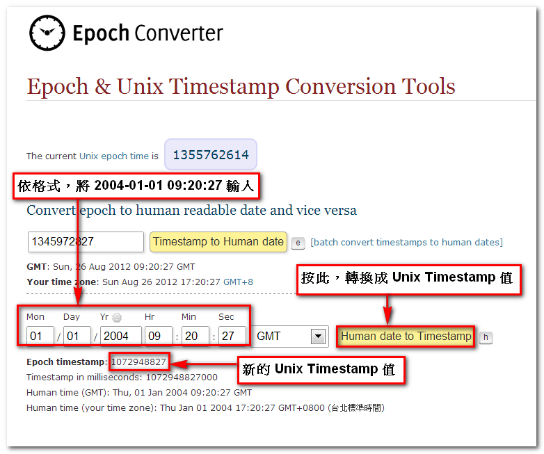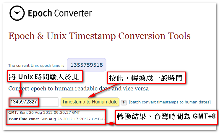 3. 利用 Epoch & Unix Timestamp Conversion Tools 網站,將其轉換成一般時間為 2012-08-26 09:20:27(GMT)。