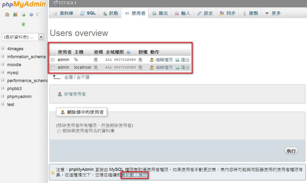 - 新增使用者(admin)兩次後,建議刪除所有預設的「root」使用者。也就是說,伺服器上,只剩下兩位剛剛所新增的使用者(admin)而已。記得點一下「重新載入權限」。