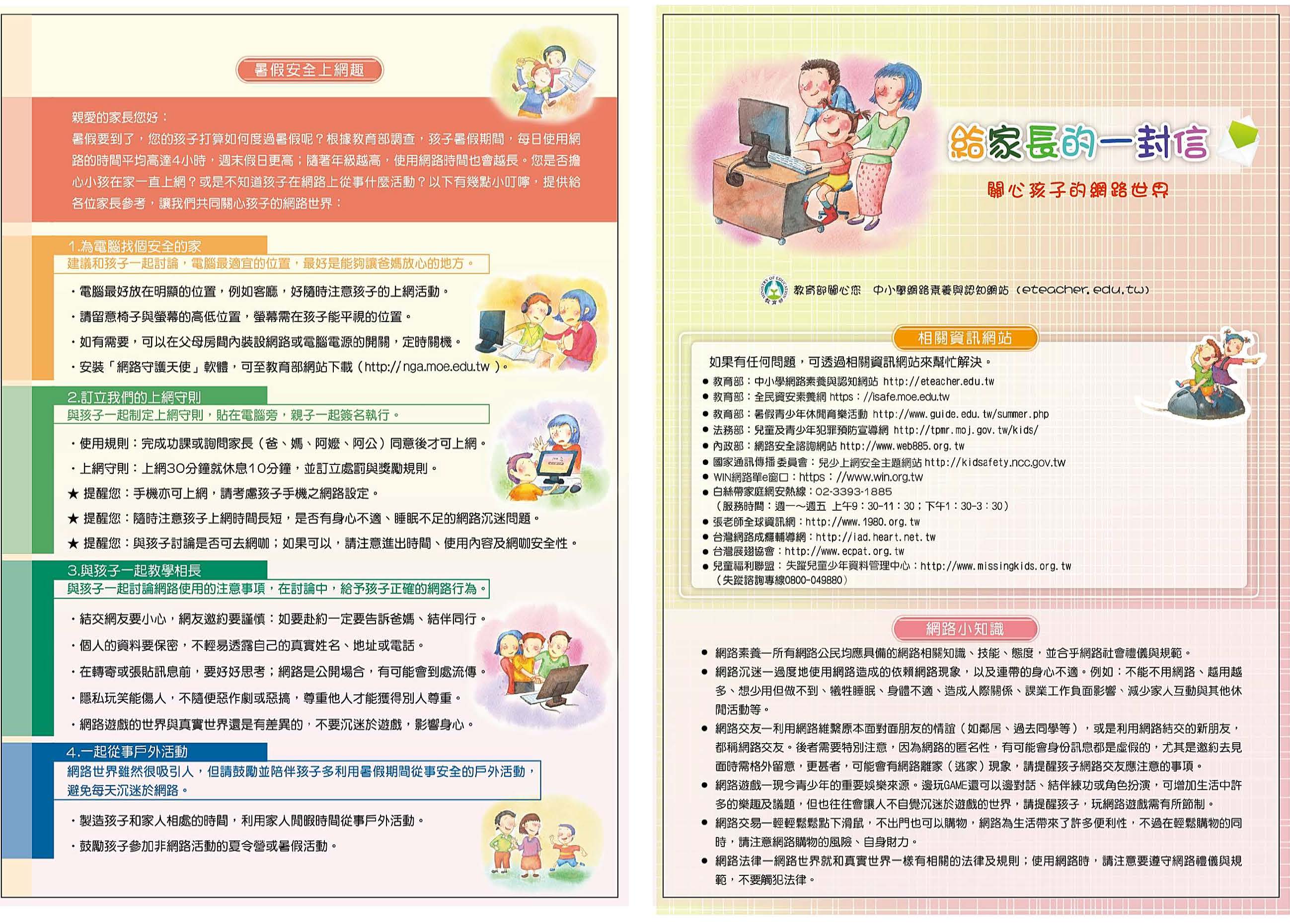 - 請轉發「給老師的一封信:關心學生的網路世界」、「給家長的一封信:關心孩子的網路世界」。