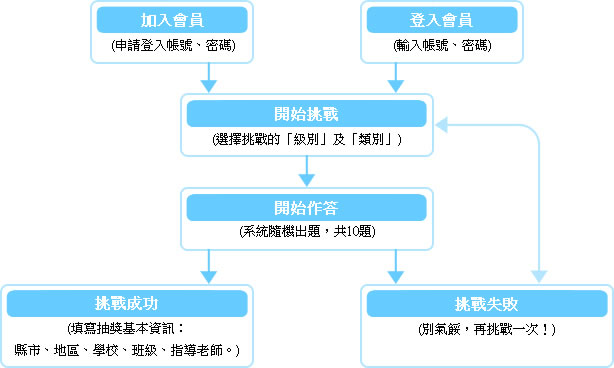 - 每個關卡會由電腦自動選出10個題目,每題1分,只要答對6題以上,並留下姓名、就讀的學校、班級、指導教師的姓名,就可以得到「網路小鐵人錦標賽」錦旗1面。(累積愈多錦旗,得獎機會愈大唷!每位同學最多可累積45次抽獎機會!)