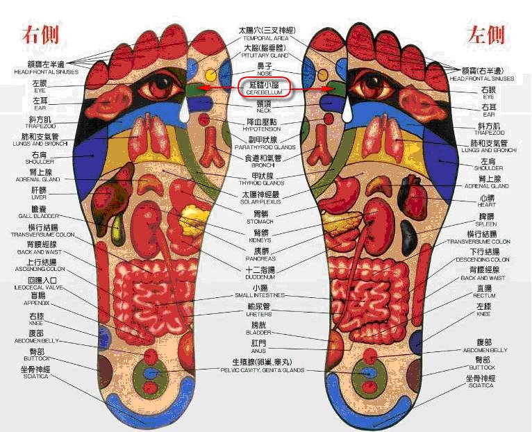 果然 , 我剛一摸她大腳趾根部的小腦反射區 , 她就嚷嚷說太疼了。