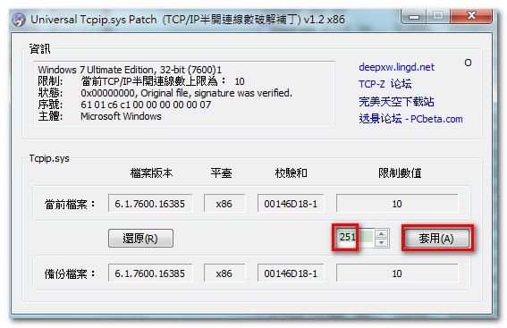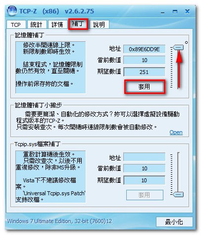 注意!此數值重新開機後,將回復為預設值 10。- XP 系統可再修改底下的 Tcpip.sys檔案補丁「期望數值」後,按下「套用」,重新開機,來維持期望值。