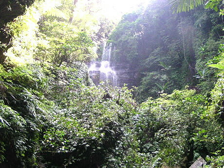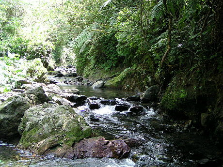 月眉坑瀑布之前的溪谷有一巨岩小丘擋住視線,所以無法一窺瀑布全貌。我看到一條模糊小徑似乎可以翻過小丘,抵達瀑布下方,但瀑布附近的環境潮濕,小丘草蕨叢生,而小徑顯得泥濘糊模,令人心生怯意。我只是遠遠站著欣賞瀑布而 已。