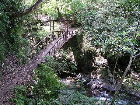 進入右岔路後,原本寬闊的碎石路變為傳統泥土山徑,路徑變小,但路徑仍然清晰。沿途可看見零星的姑婆芋,猜想這條山路可能是農民上山種墾的農路。約三分鐘後,抵達一座舊鐵橋。越過溪谷時,鐵橋有些搖晃,橋下則水流清湲。過鐵橋之後,不久,又遇一水泥橋。水泥橋附近的溪谷,靜謐而優美,此處已遠離五峰旗風景區的溪谷人潮。