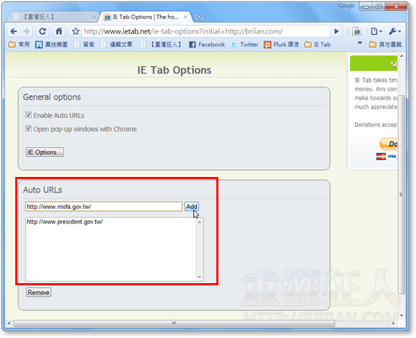 第5步 另外也可以按一下右上角的「Change auto URLs or Other IE Tab settings」按鈕按一下,將你常用的網址加入「Auto URLs」清單,以後只要開啟該網頁,便會自動在 Google Chrome 瀏覽器中使用 IE Tab 來瀏覽。