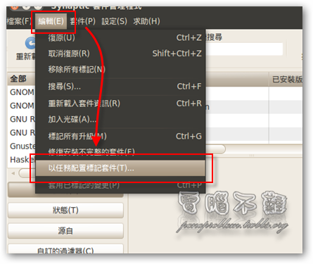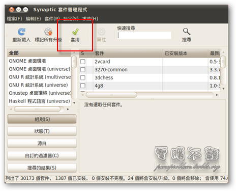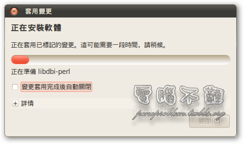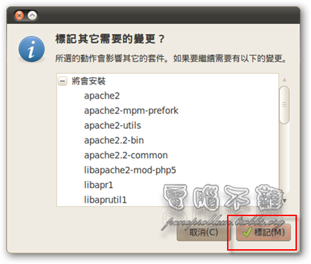 步驟一 LAMP 可以用 Synaptic 套件管理程式來下載安裝。按下「系統->管理」,可以找到「Synaptic 套件管理程式」。 步驟二 第一次執行 Synaptic 套件管理程式可能會出現簡介視窗,關閉即可。 步驟三 按下上方功能表「編輯 -> 以任務配置標記套件」。 步驟四 勾選「LAMP server」,按下「確定」。 步驟五 套件管理程式會列出所有需要要安裝的套件,按下「標記」。 步驟六 標記完按下「套用」。 步驟七 再按一次「套用」。 步驟八 稍等幾分鐘,讓他下載完。 步驟九 設定 MySQL 密碼。 步驟十 再次輸入密碼。 步驟十一 等候安裝。 步驟十二 安裝完成後,在瀏覽器輸入「http://127.0.0.1」或是「http://localhost/」,看看是不是有出現「It works」的頁面。如果有,代表你安裝而且啟用成功了! 如何安裝 phpMyAdmin?