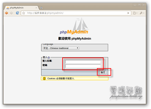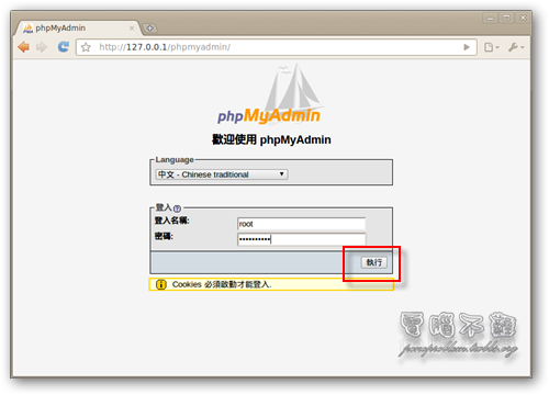 步驟一 phpMyAdmin 可以直接在 Ubuntu 軟體中心安裝。開啟「Ubuntu 軟體中心」,在搜尋框輸入「phpMyAdmin」,按下「安裝」。 步驟二 選擇「apache2」。按下「下一步」。這部份其實都按照預設的就可以了。 步驟三 安裝好後,在瀏覽器的網址列輸入「http://127.0.0.1/phpmyadmin」或是「http://l ... phpmyadmin」,看看是不是能成功進到 phpmyadmin 的頁面。 步驟四 輸入帳號密碼登入看看,預設的帳號是「root」,密碼即是你安裝 MySQL 時設定的密碼。 步驟五 成功登入 phpmyadmin。 如何讓網站外連?
