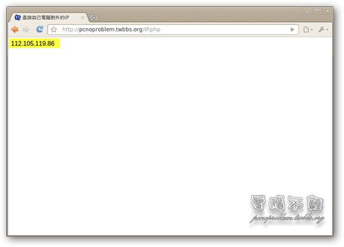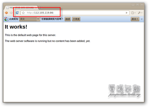 架設一個網站,如果只能給自己看,那麼一點意義也沒有。如果要讓別人也能瀏覽,必須先得知自己的 IP 位址,每台電腦都有自己的 IP 位址,就像是房子的住家地址,你要告訴別人你的地址,別人才能找到你的家。那要如何得知自己的 IP 位址呢?可以在終端機下輸入「ifconfig」。 如果你看不懂終端機那些怪異的文字在寫什麼,可以連到這裡來察看。 將 IP 位址輸入到瀏覽器的網址列,測試 IP 位址是否能使用。 停止、啟用、重啟 Apache