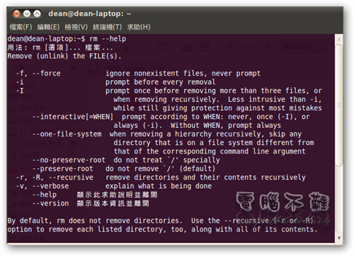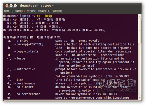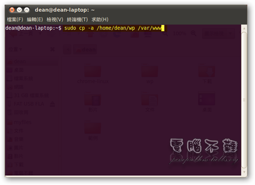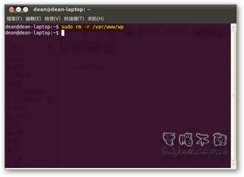 欲複製檔案或是資料夾到 /var/www/ 目錄下,可用「cp」指令,但別忘了要在之前加上「sudo」來提升它的執行權限。有關 cp 的用法可以參考「cp --help」。 舉個例子,假設我要在 Ubuntu 內架設 Wordpress,那就先將準備好的 WP 資料夾複製進 /var/www/ 即可,輸入指令「sudo cp -a /home/dean/wp /var/www」。 以上的 cp -a 是將權限也一起複製,也就是說,雖然 /var/www 裡的檔案你不能編輯,但在 /var/www/wp 下,檔案擁有者卻是你的名字。也就是說,你能在複製進來的資料夾內任意的建立、刪除、修改檔案或是資料夾。 刪除檔案或資料夾