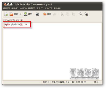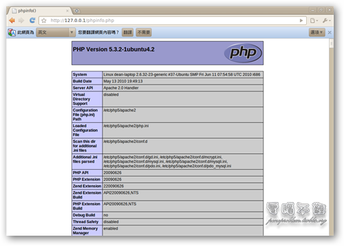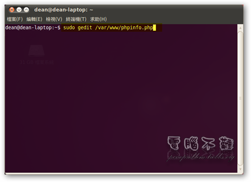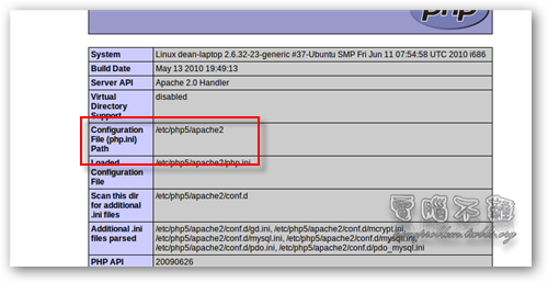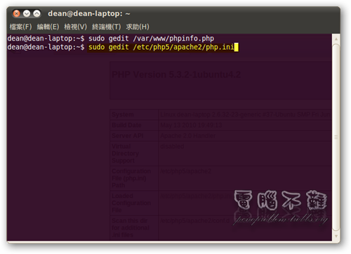 直接使用 PHP phpinfo() 函式即可列出主機的詳細資訊。首先我們要在根目錄 (/var/www) 下建立一個 phpinfo.php。開啟終端機,在終端機下輸入「sudo gedit /var/www/phpinfo.php」。 給gedit sudo的權限才能編輯或建立/var/www目錄下的檔案,我們在gedit輸入PHP程式「<? php phpinfo(); ?>」,然後存檔。 接著到瀏覽器的網址列上輸入「http://127.0.0.1/phpinfo.php」或是「http:// ... hpinfo.php」,就可以看到主機的資訊及一些設定值了! 這裡我們要注意的事 php.ini,php 設定組態檔案放置的位置。基本上都是在「/etc/php5/apache2/php.ini」。 如何修改 php.ini 組態設定檔?
