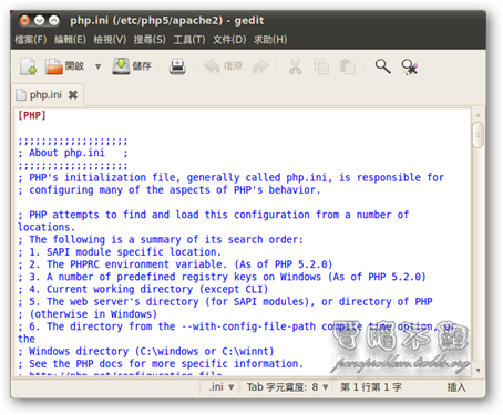 php.ini 存放著所有 php 的設定組態,是個很重要的檔案,若想要修改 php.ini,可以在終端機下,輸入「sudo gedit /etc/php5/apache2/php.ini」,即可付與 gedit sudo 的權限去編輯 php.ini。 了解以上的基本設定及使用方法後,在 Ubuntu 下便可以很輕鬆順利地架設網站了! --