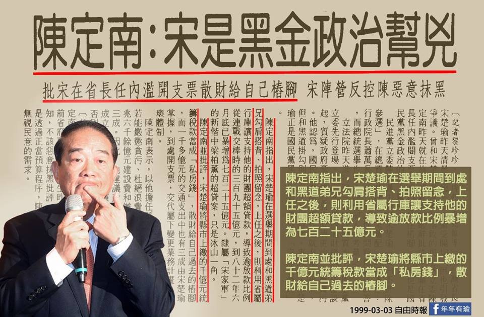 陳定南當然就批評宋楚瑜是黑金政治的幫兇。圖:網路。