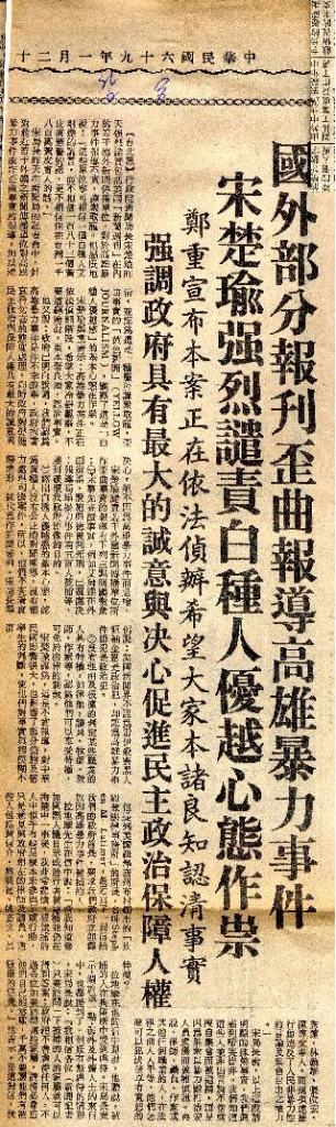 隔年,宋楚瑜對於美麗島事件繼續追殺外國媒體。宋楚瑜於1980年1月25日發表公開談話,強烈譴責《新聞週刊》歪曲美麗島事件事實。3月20日,宋楚瑜抨擊美聯社有關美麗島事件的報導,並揚言如果再不公正報導,將考慮中止其新聞來源。無獨有偶,當時在美國擔任《波士頓通訊》主編的馬英九,則是以社論痛斥美麗島事件「暴民」。