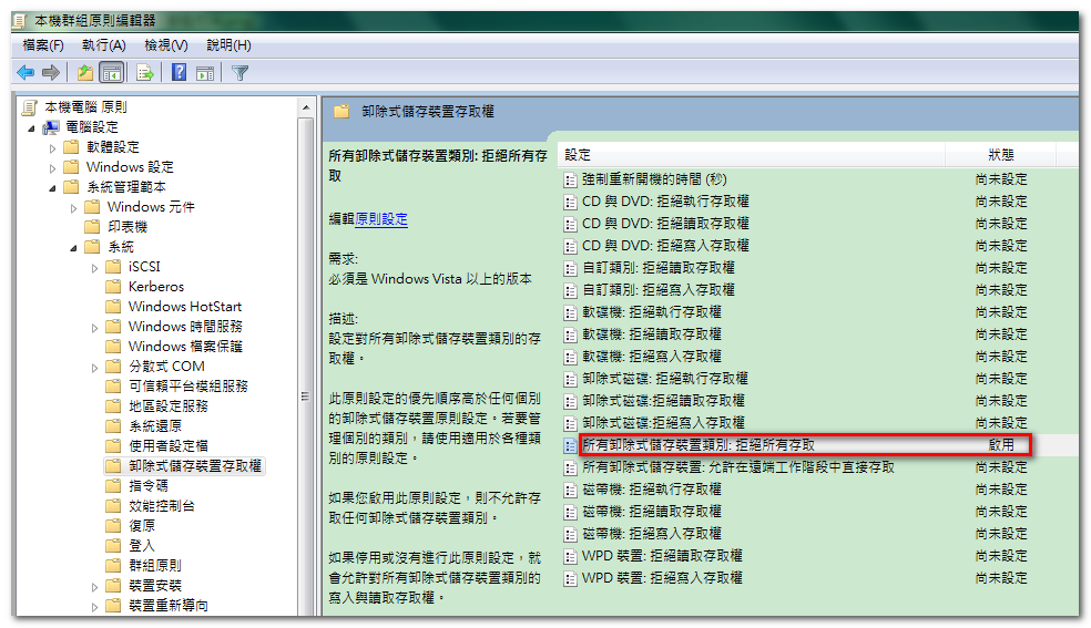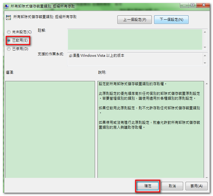 - 如果您啟用此原則設定,則不允許存取任何卸除式儲存裝置類別。