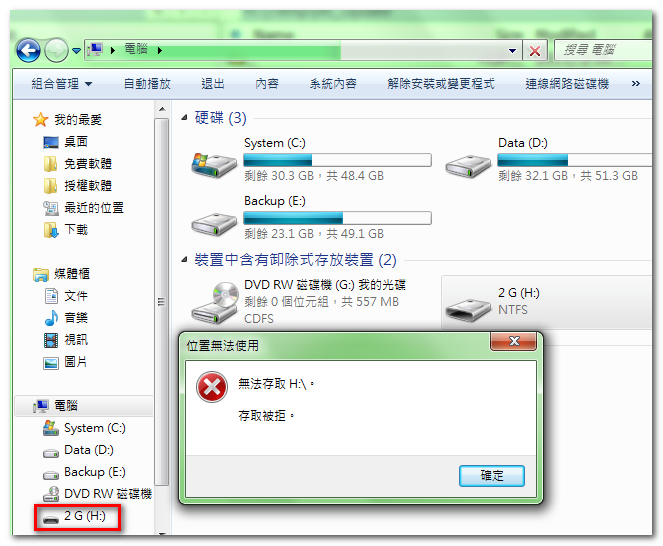 - 例如:筆者的隨身碟「2 G(H)」因此設定後,已無法存取。