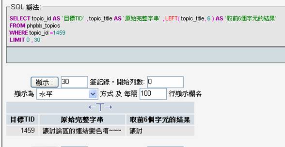 在來我們來看看在使用MySQL4.1以上 + utf8_general_ci 的資料庫『這範例圖片是MySQL5.0.27的環境』 這樣的結果就非常令人滿意了,我要求取出前6個字元我的MySQL5這台伺服準確的把『讓討論區的連』取出來