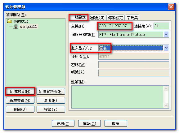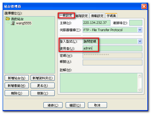 - 登入:一般使用「匿名」登入即可。若要使用帳號登入,則建議使用「詢問密碼」的登入型式。