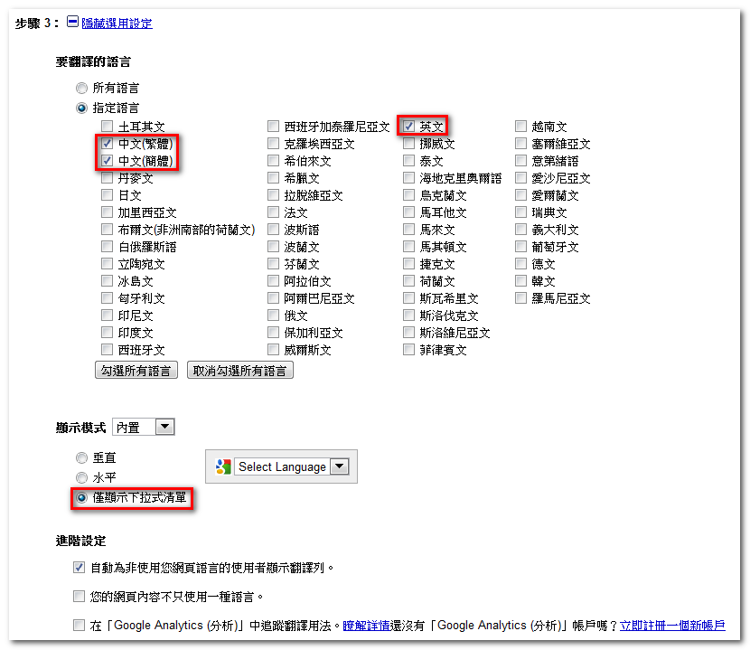 • 進階設定:預設為「自動為非使用您網頁語言的使用者顯示翻譯列」。可以視需要勾選。