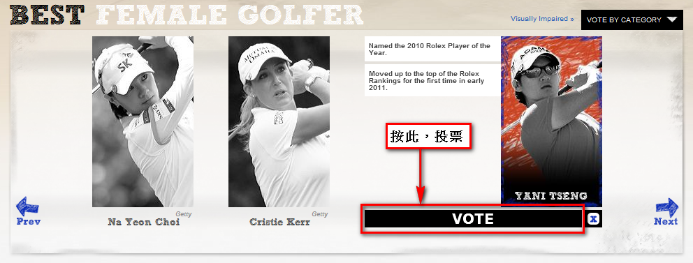 今年曾雅妮獲得最佳女子高球運動員的入圍肯定,讓她也有機會和偶像「索后」索倫絲坦一樣獲獎。索后曾6度領獎,去年則由歐秋阿獲得殊榮,台灣球迷如果支持妮妮,可以替妮妮衝票數。球迷只要在台灣時間7月10日中午之前,上網http://espn.go.com/espys/?&signup=success#!/voting/ ,就能投妮妮一票。