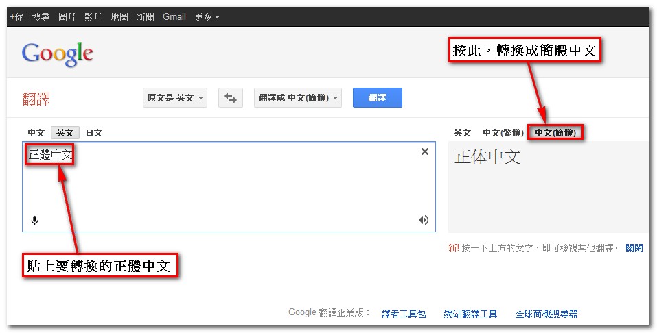 - 貼上要轉換的「繁體(簡體)中文」於左邊窗格,點選中文「簡體(繁體)」即可顯示轉換的文字於右邊窗格。