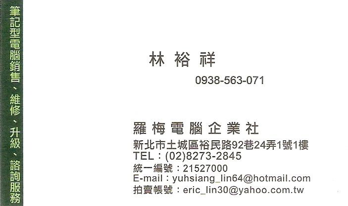 - 店名:羅梅電腦企業社(筆記型電腦銷售、維修、升級、諮詢服務)