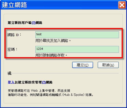 若選擇『建立新網路』,會請你設定網路名稱與密碼,按下確認即建立成功。 選擇『加入現有的網路』,則是輸入別人已經創立好的網路名稱與密碼後,就可以加入形成虛擬內網囉! 如此一來,你就能夠和其他人進行區域網路遊戲連線,或者互相聊天、傳檔等等。