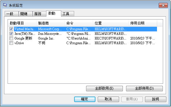 1.要啟用 msconfg ,可點擊 [開始] > 在 [搜尋程式及檔案] 內,輸入 msconfig 來啟用。另外種方法,點擊 [開始] 找到命令提示字元並開啟,在其內輸入 msconfig 後,按下鍵盤的 [enter] 鍵。 2.開啟後,便可以看到 msconfig 圖形化介面。在[一般]的頁籤內,可針對 Windows 啟動時,進行設定。 3.在[開機]頁籤,可在其內設定開機選項,點擊[進階選項],可設定開機的 CPU 處理器數。 4.在[服務]頁籤,可在其內設定開機要啟用的服務選項。 5.在[啟動]頁籤,可在其內設定要隨開機程式而啟用的程式選項,若要取消,可將啟動像目前的勾選取消即可。 6.在[工具]頁籤,會將 Windows 內的內建小工具都放到這裡,且可在這裡直接啟用該工具程式,例如想要得知電腦軟硬體相關資訊,可選擇[系統資訊]後,點擊[啟動]。 --