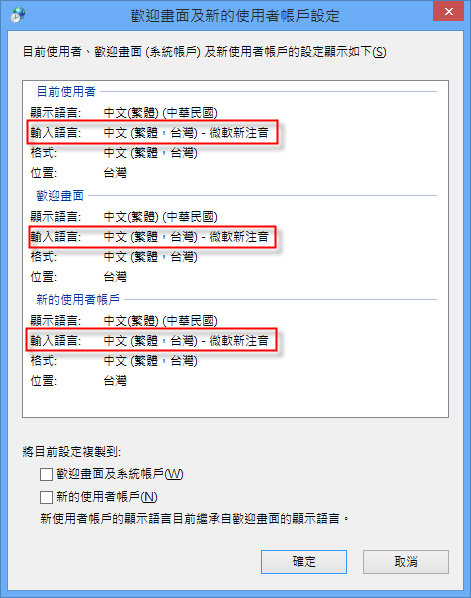 你的目前使用者之輸入語言已經被更改,你只要選取複製到[歡迎畫面及系統帳戶],剛剛的設定會立即被套用。