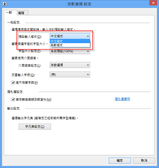 在[預設輸入模式]下拉式清單中選取中文模式或是英文模式,按一下[確定]按鈕。