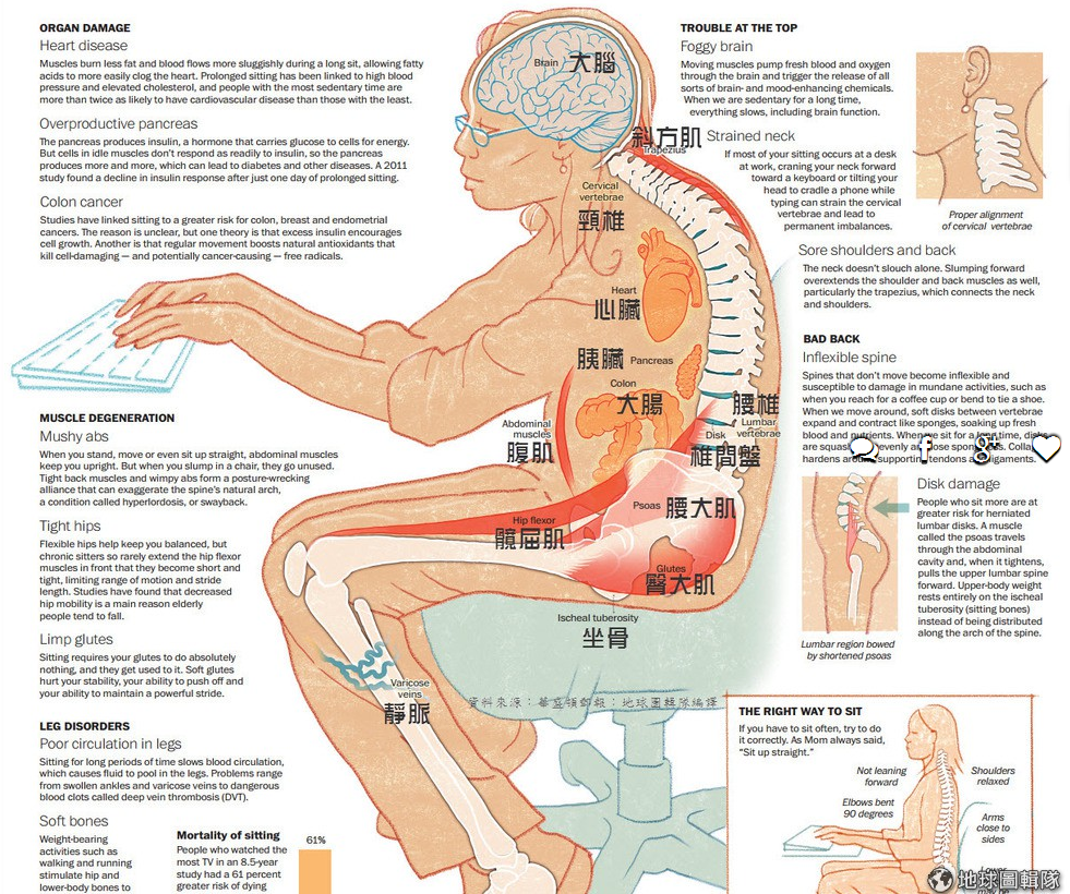 這邊就有專家很乾脆地用清楚圖說告訴你,如果一天8個小時都坐在椅子上的話,不只是變胖那麼簡單,你的心血管、肌肉和大腦都會出狀況。