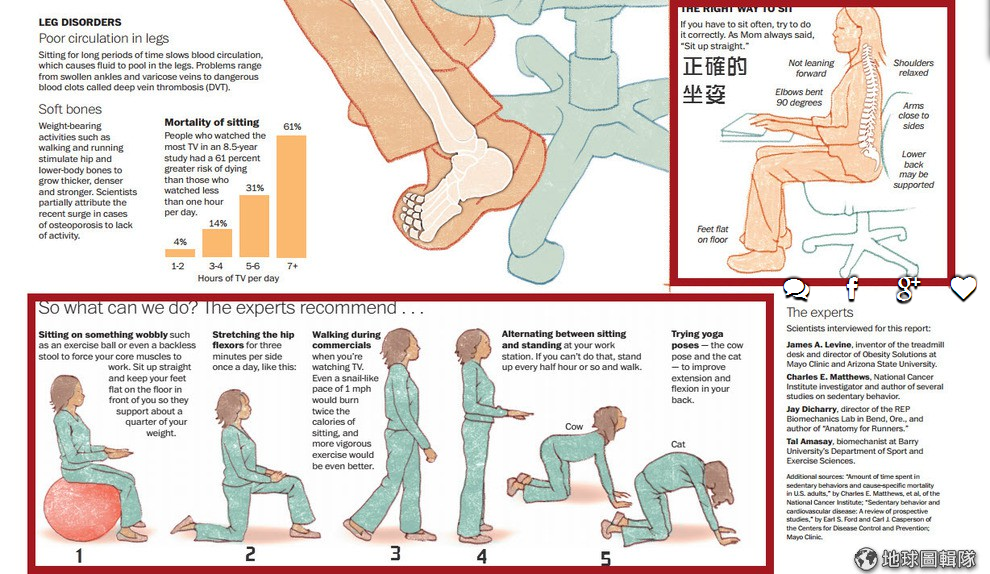 我們都知道坐著太久不只變胖其實對健康也不好,過去也已經有不少醫學專家用分析或案例告訴我們坐太久的壞處,但一想到都工作了一天還要運動就只 覺得累,結果就是,我們把複雜的致病因素或是難懂的病名拋到腦後,繼續窩上沙發看電視。