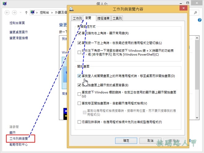 Windows 8最大的特色動態磚的【開始畫面】,針對Wwindows 8傳統桌面的支援顯得薄弱的許多,因此Windows 8.1加強了傳統桌面的功能,請在桌面上按下滑鼠右鍵出現「個人化」視窗,接著再點選左下的「工作與瀏覽」(或在下方工作列空白處按下滑鼠右鍵再選「內容」),最後點選【瀏覽】分頁。Windows 8.1千呼萬喚始出來,不用任何的第三方工具,只要輕輕鬆鬆勾選「當我登入時顯示桌面,而不要顯示開始畫面」,即可快速的直接進入桌面哦!