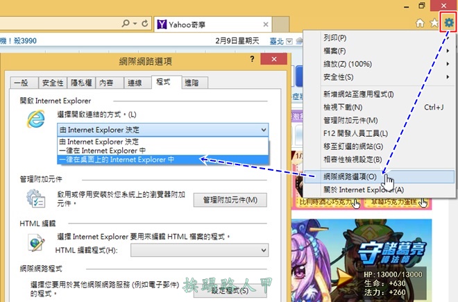 首先進入桌面畫面上,在工作列上按下IE瀏覽器的小圖示,當開啟IE瀏覽器後,請選按右上的齒輪工具圖示,此時出現的功能表並選擇「網際網路選項」。切換至〔程式〕分頁標籤上,在「選擇開啟連結的方式」下指定「一律在桌面上的Internet Explorer中」,這樣就可以將IE瀏覽器的預設值改變由Desktop版來執行。