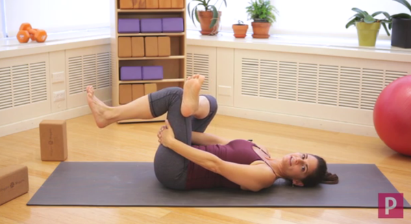 平躺,雙腳抬離地面,膝蓋彎曲,左腳在右腳之後,手掌貼近兩隻腳掌,雙腳朝胸口方向壓緊,保持雙腳彎曲,維持姿勢 30-60 秒鐘,換邊進行。