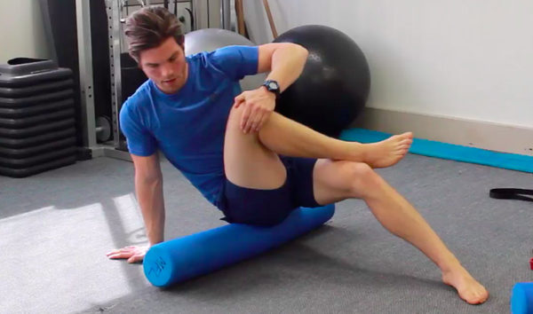 採坐姿,將軟泡墊放在臀部後,雙腳平放在地板上,右手支撐地點,重心放在右臀部,讓軟泡墊從臀部底部滾到盆骨,來回按摩髖部肌肉 30-60 秒後,換邊按摩。