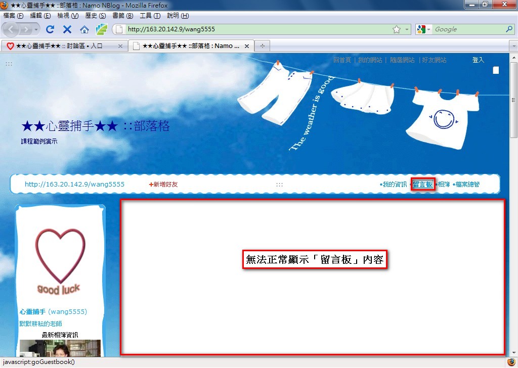2. 瀏覽示範網站,點選留言板,發現無法正常顯示留言板。