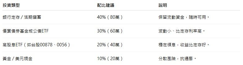 - 優質債券基金或公債ETF 30%(60萬) 波動小、比定存利率高。